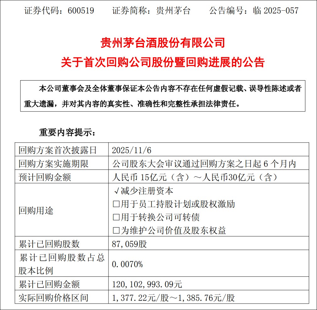 1月4日晚,贵州茅台酒股份有限公司(贵州茅台,600519.SH)公告称,2025年12月31日,公司通过集中竞价交易方式首次回购股份87059股,已回购股份占公司总股本的比例为0.0070%,购买的最高价为1385.76元/股、最低价为1377.22元/股,已支付的总金额约为1.2亿元(不含交易费用)。