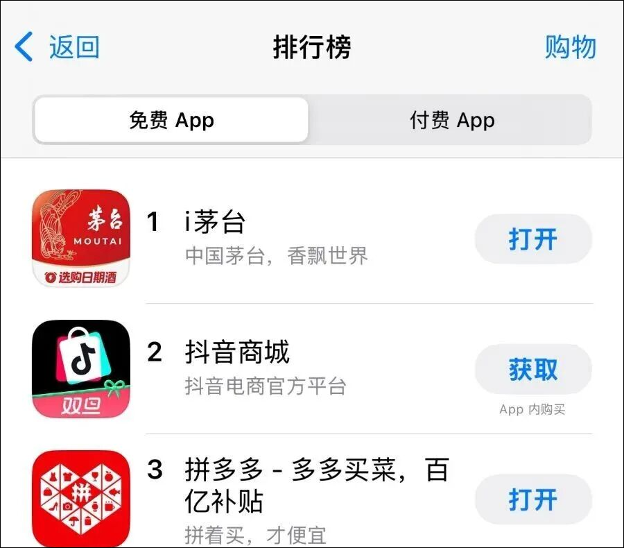 1月4日,记者注意到,贵州茅台旗下“i茅台”APP已冲上苹果应用商店购物免费榜第一名,并在免费总榜单中位列第四。
