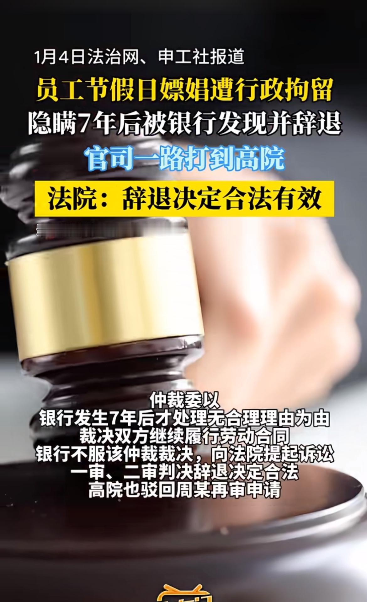 这案例真是让人看得目瞪口呆!员工周某嫖娼被行政拘留这事儿,从2011年拖到2017年才处理,这时间跨度也是够长的。周某嫖娼后一直瞒着银行,7年后才被查实,银行这反应也是够慢的。 从法律和制度层面看,用人单位有规章制度来处理员工违规行为是合理的。但周某的违规行为拖了这么久才被处理,让人不禁怀疑这处理的时效性和公正性。劳动仲裁认定用人单位解除劳动关系行为不当,也反映出在处理这类事情时需要考虑更多因素,比如合理的处理期间,要保护劳动者的合法权益。这也提醒了用人单位,发现问题得及时处理,不然很容易引发争议。