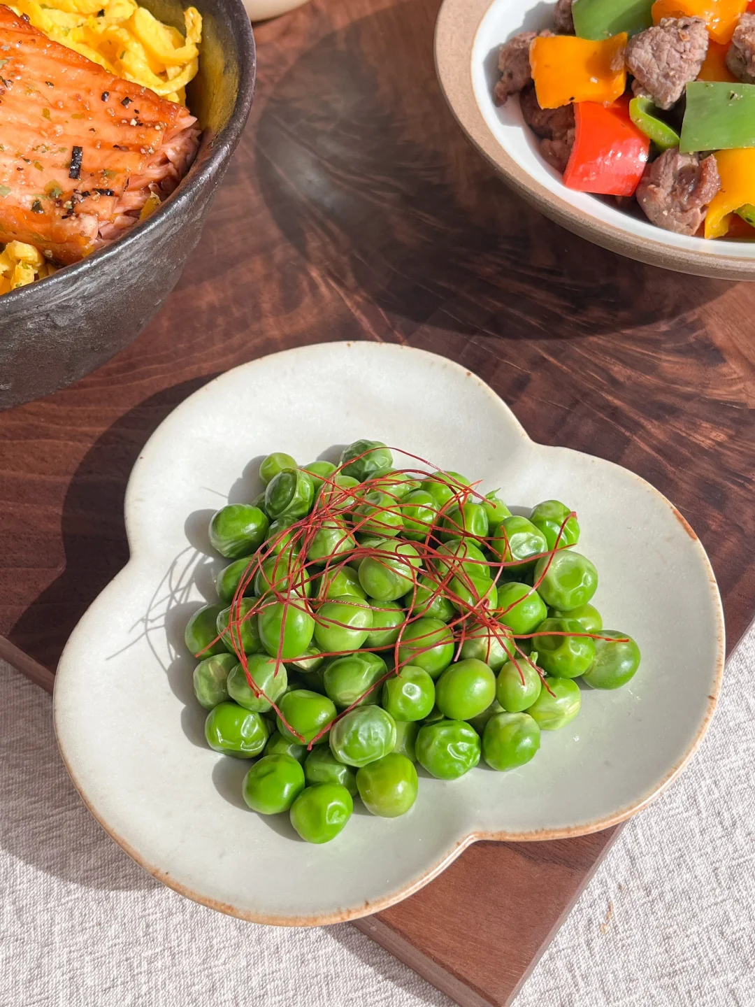 “春天开始就有许多的应季蔬菜可以吃了,嫩豌豆也上市了。嫩豌豆的颗粒很小,香味浓郁又甜嫩,剥好的豆子用盐水煮一下就很好吃~” 今日午餐: ¹照烧三文鱼饭🍱 ²彩椒炒牛肉🥩 ³盐煮甜豆🫘 ⁴柠檬养乐多🍋