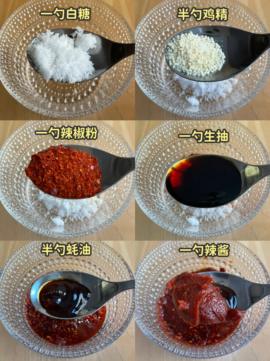 ❶准备酱汁:一勺白糖、半勺鸡精、一勺辣椒粉、一勺辣酱、一勺生抽、半勺蚝油、白芝麻,加水稀释