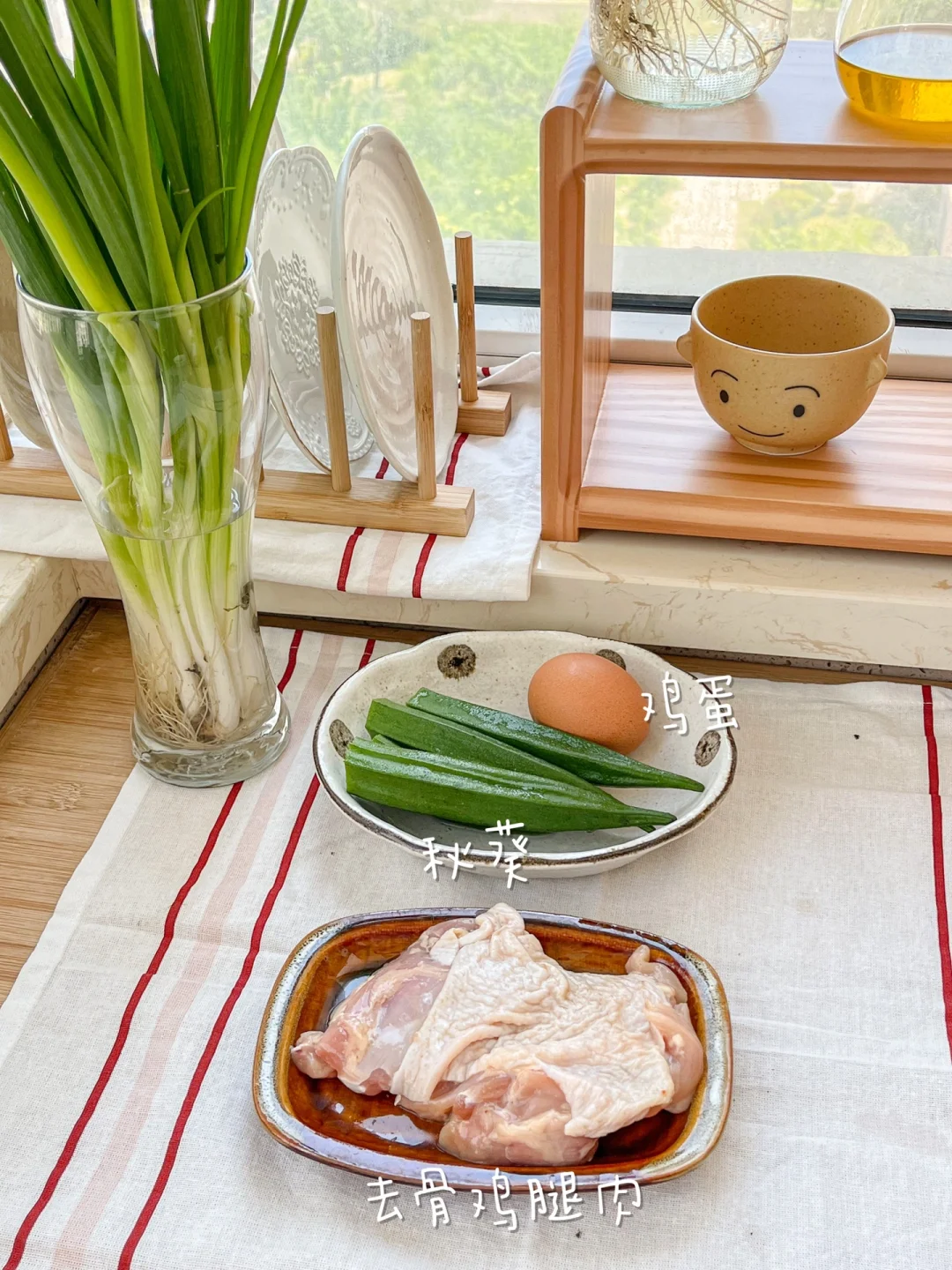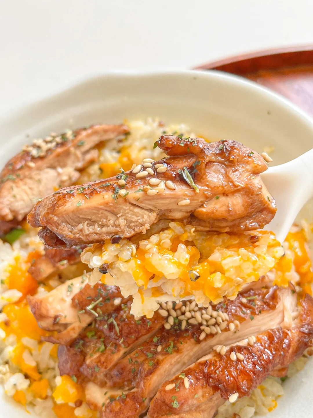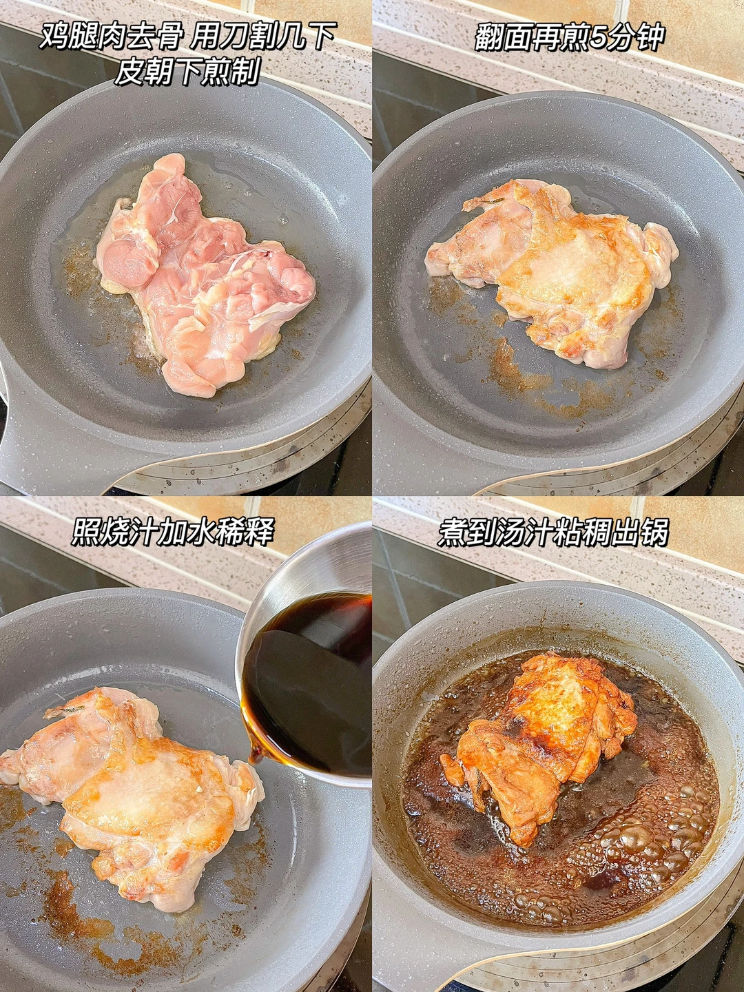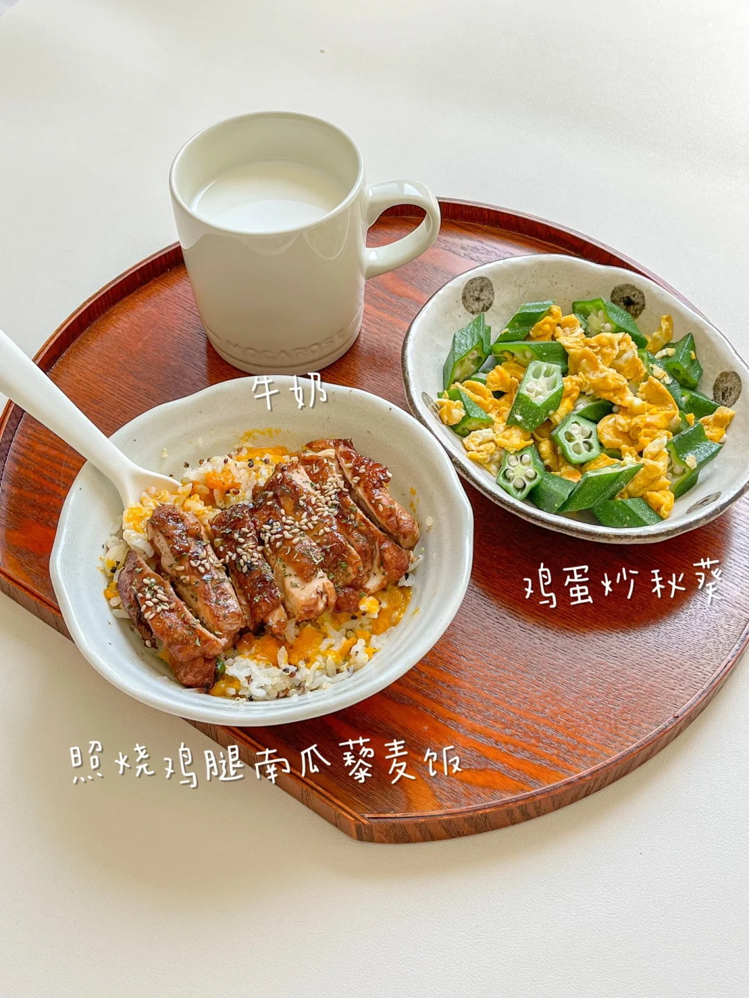 今日午餐: ¹照烧鸡腿南瓜饭 ²秋葵炒鸡蛋 ³牛奶 🟤照烧鸡腿南瓜饭 一个大鸡腿去骨对半切开,可以吃两顿,先煎有皮的那面,煎出油脂再翻面。提前在肉里面划两刀,煎的时候就鸡肉就不会“抽抽”了。照烧汁加一杯水,小火焖5分钟,最后大火收汁。一定要留点汤汁拌饭吃! 🟢秋葵炒鸡蛋 秋葵特有的黏液对肠胃可起到很好的调节作用,而且秋葵的钙质很丰富,容易被吸收,再加上优质蛋白,是非常营养健康的搭配。鸡蛋炒的嫩一点会更好吃[哇R]