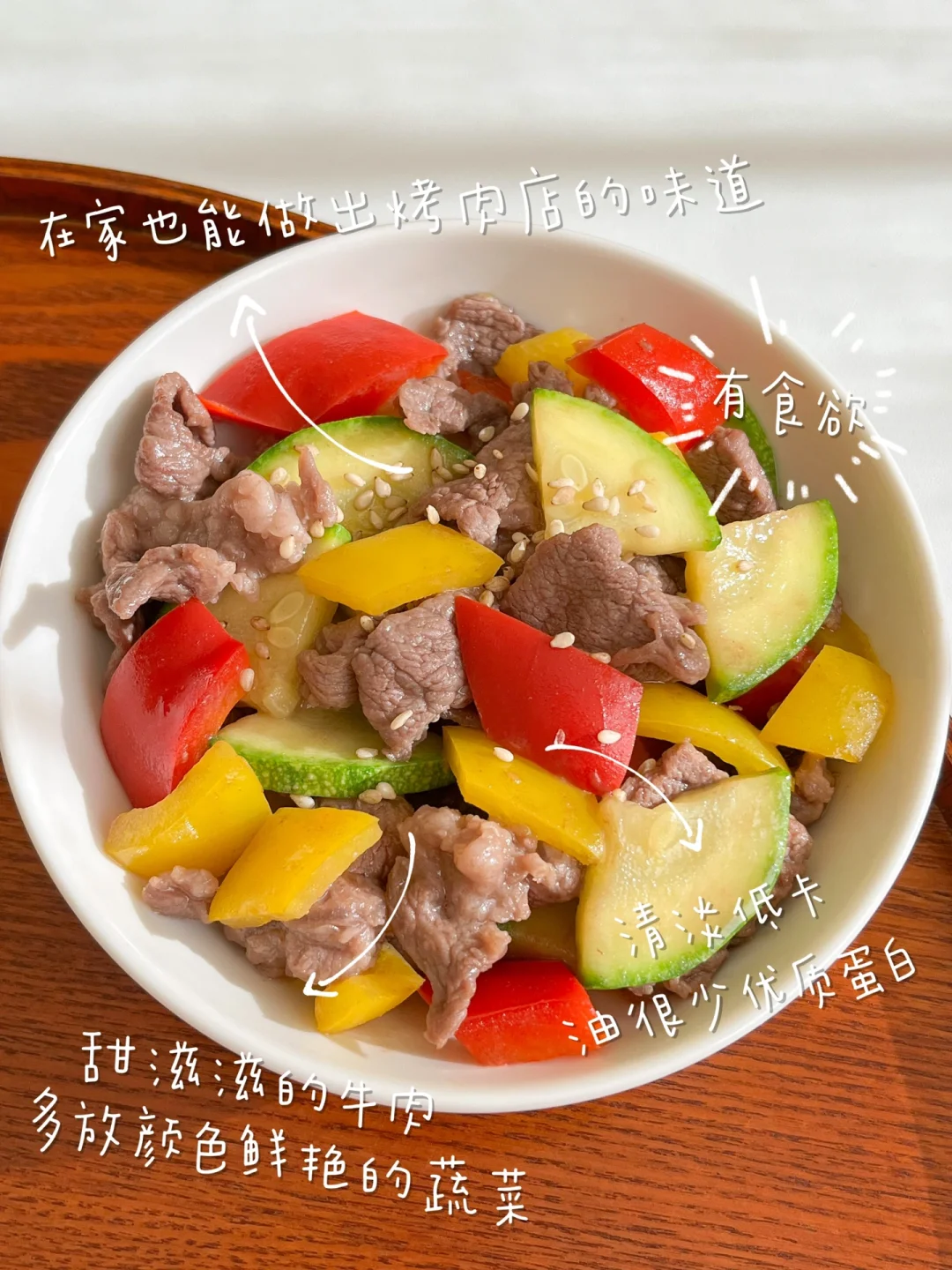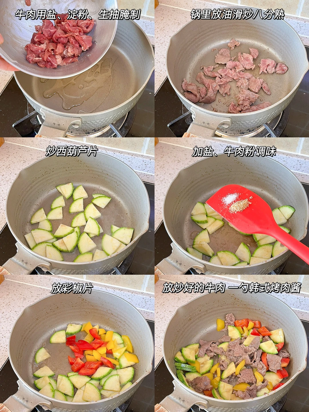 4.放彩椒片和牛肉,加一勺韩式烤肉酱,炒匀出锅