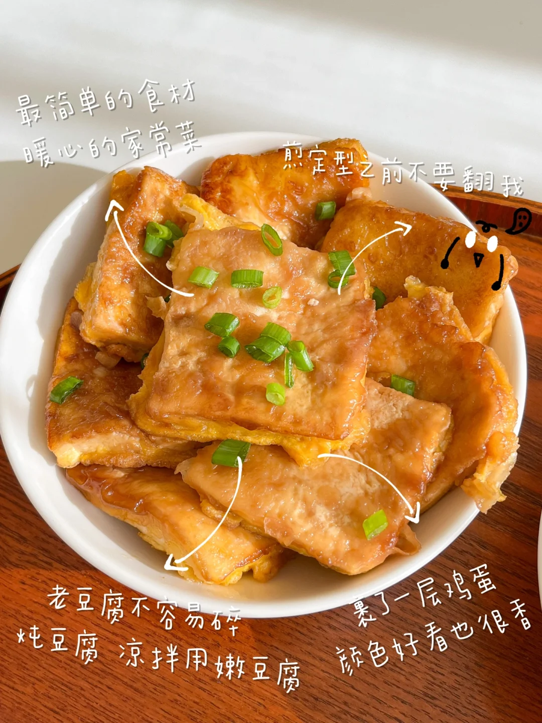 1.半块老豆腐切小块,沾上面粉再裹一层蛋液