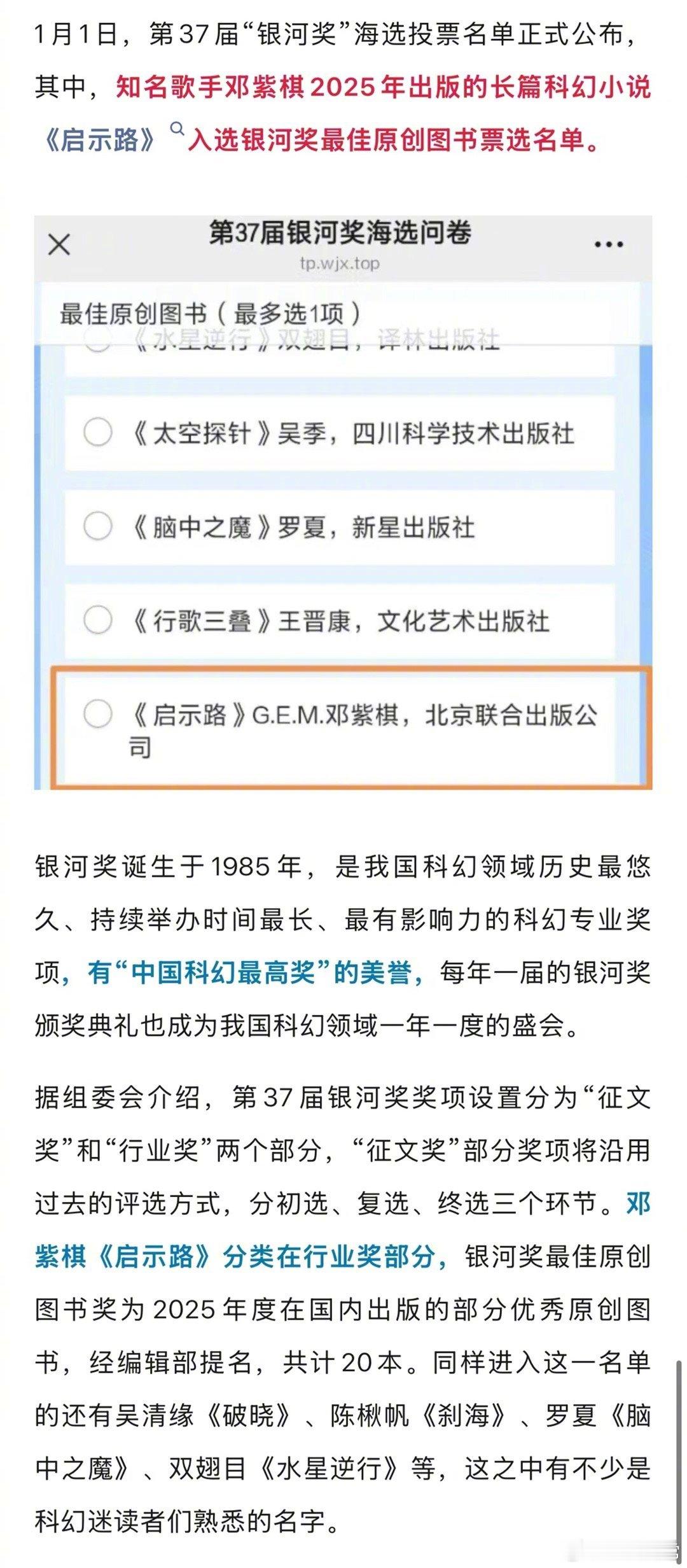 邓紫棋说自己的科幻小说入选了银河奖,银河奖说没有:当前阶段为银河奖的初选环节,不