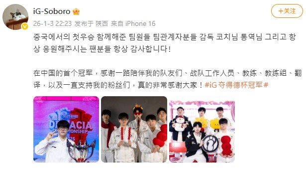 iG夺德杯冠军后,上单选手Soboro更新社媒,并配文:在中国的首个冠军,感谢一路陪伴我的队友们、战队工作人员、教练、教练组、翻译,以及一直支持我的粉丝们,真的非常感谢大家!这哥们的表现真可以,是个敢打且不送的可靠战力。不过对线细节上仍有提升空间,尤其日后面对 369、圣枪哥或 Bin 这类顶尖上单时将迎来真正的考验,但这份德杯冠军无疑是最好的开端。加油 Soboro,期待你在新赛季的成长!新人上单Soboro霸气发言iG夺得德杯冠军2026LPL