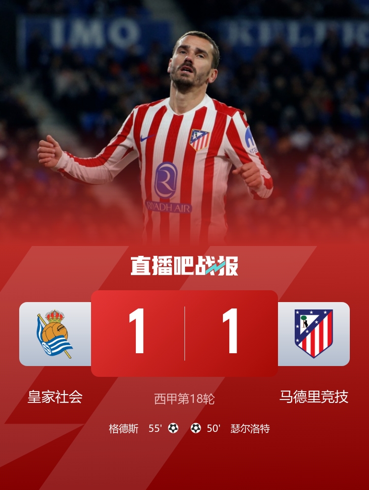 直播吧1月5日讯北京时间1月5日凌晨4时整,2025-26赛季西甲第18轮在阿诺塔球场展开角逐,马德里竞技客场对阵皇家社会。上半场瑟尔洛特乌龙越位无效,下半场瑟尔洛特先拔头筹,小西蒙尼助攻,格德斯扳平,久保建英助攻。最终马竞客场1-1战平皇家社会,马竞各赛事4连胜终结,积38分仍居第4+距榜首巴萨11分,皇社联赛5轮不胜。