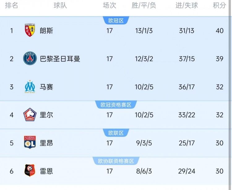 朗斯积40分排名法甲榜首,巴黎圣日耳曼积39分位居次席,据Opta统计,同一个赛季两支球队17轮过后积分39+,法甲历史第三次出现这样的情况,此前两次是2016-2017赛季、2022-2023赛季。