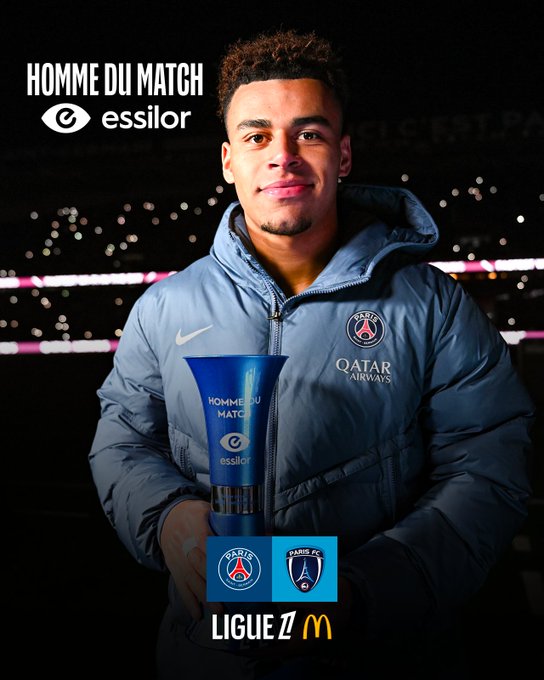 打入一球,杜埃当选巴黎圣日耳曼2-1巴黎FC全场最佳球员