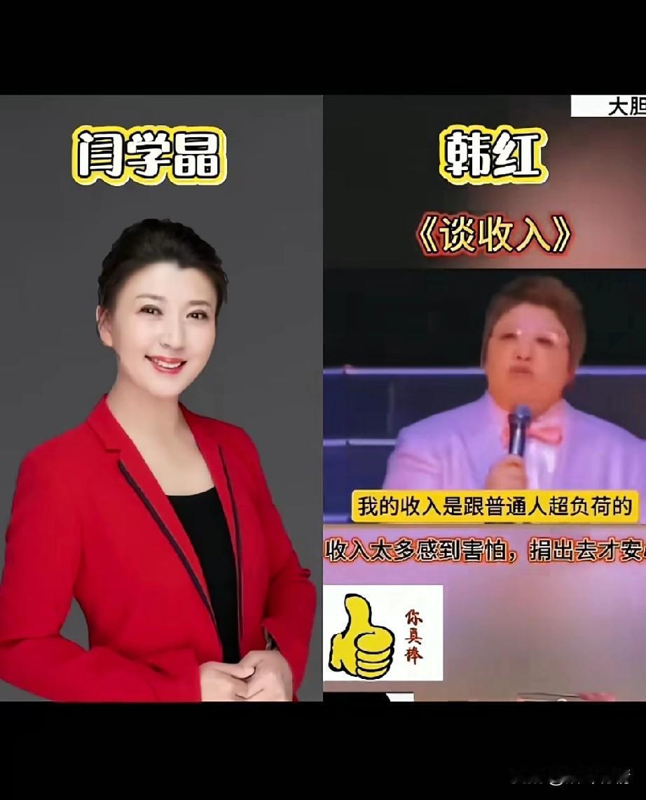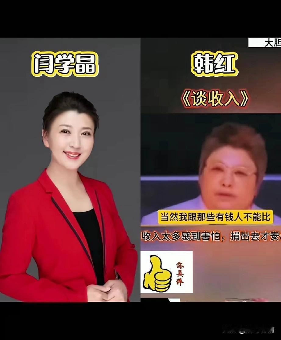 网友将韩红在领奖台上的发言放了出来,旁边贴了一个闫学晶老师的图片, 讽刺感直接拉满, 没有对比就没有伤害, 将韩红老师放在这里, 才知道韩红老师的伟大, 韩红老师谈到收入的时候, 表示自己的收入太高了, 让她感到非常的不安, 当然她的收入不能和富人相比, 可是她依然觉得自己的收入比普通人超多,让她看到还有很多中国人吃不上饭,她心如刀绞, 于是这才成立了韩红基金会, 想要帮助那些需要帮助的人, 这就是大家为什么相信韩红老师, 不相信某些捐款机构, 毕竟那些捐款机构能把物资进行倒卖, 而韩红基金会却每次冲在最前线, 他们中很多不要工资的义工, 默默的为中国的穷人服务, 如果现在还写历史的话, 相信韩红会在历史上书写浓厚的一笔, 这样的艺人值得尊敬, 比那些只知道偷税偷税的劣迹也好多了,闫学晶老师在直播哭穷, 刺痛了广大人民群众的神经, 所以网友才会在网络上讽刺她, 演了一辈子穷人她最瞧不起穷人! 早已脱离了老百姓, 才会说出那样不中听的话, 大家觉得韩红是不是胜过闫学晶千倍万倍? 韩红 韩红慈善一姐 韩红慈心 跨界女王闫学晶