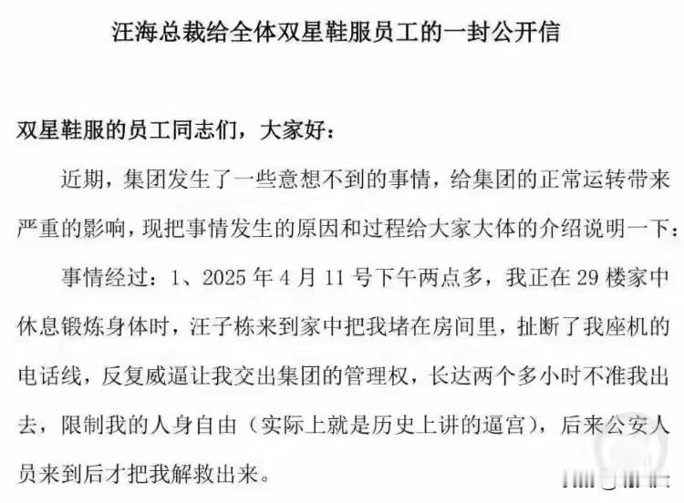 🔥把84岁老父亲堵房间,扯断座机电话线,逼迫交出集团管理权,限制人身自由长达两小时,直到公安上门才被解救出来!这是亲儿子能干出来的事吗?难怪84岁“中国鞋王”发声明与子媳断绝关系,背后真相令人愤怒💢 2026年开年,百年鞋企双星名人上演了一场惊心动魄的家族内斗大戏。1月3日,84岁的创始人汪海发布声明,正式与儿子汪军、儿媳徐英断绝父子及姻亲关系。 这场矛盾早有端倪。2022年,儿媳徐英控股的公司通过增资成为双星名人第一大股东,汪海虽保留职位,但实则失去公司绝对控制权。2025年,矛盾彻底公开化,汪海曾发文控诉儿子儿媳及孙子通过“抢夺公章、限制人身自由”等手段逼迫交权。同年5月,公司董事会免去汪海董事长职务,双方就此展开“拉锯战”,多次对簿公堂。 此次汪海在声明中列出多条理由,称汪军与徐英均为美国身份,而双星名人作为民族品牌,绝不能让“美国身份的人”接班。此外,汪军掌权后还搞“去创始人化”,拆除门头上汪海头像、停用其名下商标。汪海还透露,自己遭到经济封锁,工资存款被扣,母亲养老钱被侵占,甚至车辆被安装窃听定位器,人身自由受限。 面对亲情崩塌,汪海宣布将成立“双星名人品牌接班委员会”,主张“能人接班”和“职业经理人接班”。这场围绕鞋企控制权的纷争,究竟会如何收场,令人拭目以待。 图片来自网络,侵删!