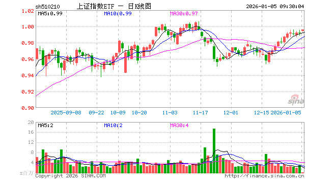 1月5日,上证指数ETF(510210)开盘涨0.20%,报0.994元。上证指数ETF(510210)重仓股方面,农业银行开盘跌0.39%,贵州茅台涨0.57%,中国石油涨0.00%,工业富联涨2.00%,恒瑞医药涨0.82%,三一重工跌0.09%,紫金矿业涨2.41%,中国银行涨0.00%,招商银行涨0.90%,邮储银行涨0.18%。