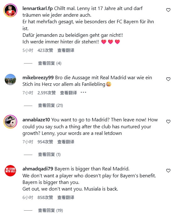直播吧01月05日讯17岁的拜仁新星卡尔在出席活动时公开表示未来想去皇马,这在德国足坛引发巨大反响,目前卡尔的社媒评论区已经被批评声占领。