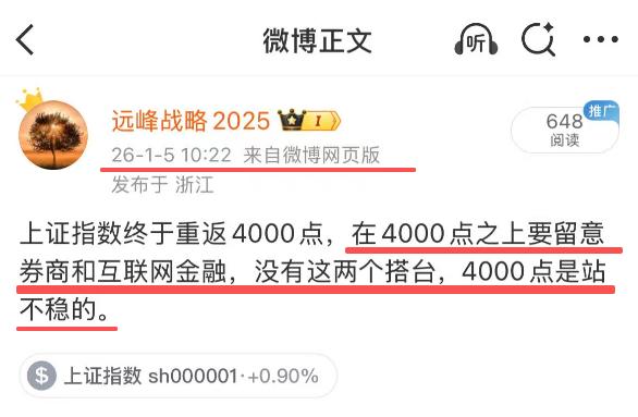 大盘指数终于重返4000点,2026年第一天的一马当先,开门红行情应该是稳了。至于这次重返4000是否能站稳,能否就此把4000踩在脚下,就取决于券商和互联网金融这两个板块的态度。如果这两个就此开始一路狂奔,那么4000点就再也看不到了。 如果券商和互联网金融这两大板块接下来几天泄气了,那么大盘还将到4000以下再待几天。 4000点对于2026年全年来说,在我看来就是妥妥的底部区域,今年将有大行情,一切回调皆是上车机会,且行且珍惜。
