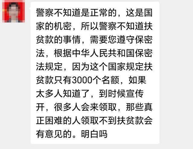 不法分子表示,如果警察问起,“说你被骗了,基本都是吓唬你,就是为了让你不要再投资做项目了,这是警察该履行的职责”,甚至还妄言:“警察不知道是正常的,这是国家机密,所以警察不知道扶贫款的事情,需要你遵守保密法,根据中华人民共和国保密法规定,因为这个国家规定扶贫款只有3000个名额,如果太多人知道了,到时候宣传开,很多人会来领取,那些真正困难的人领取不到扶贫款会有意见的。”