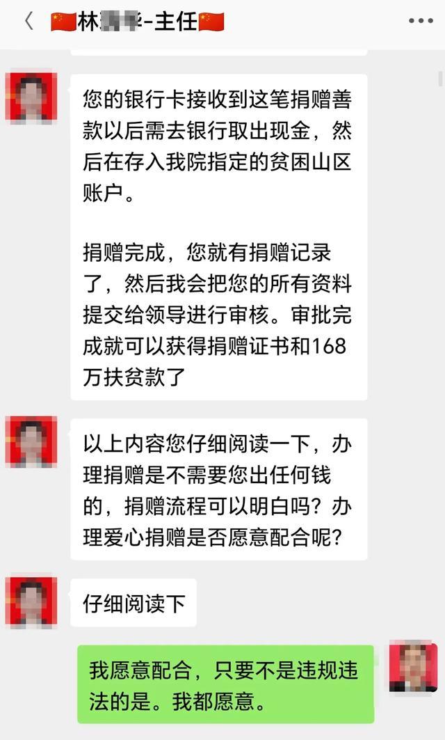 接着,“林主任”表示,肖某没有为国家做过爱心捐赠,暂不符合领取扶贫资金的条件,需要先捐赠爱心款给偏远山区儿童才能领取扶贫资金。“林主任”特别强调,捐赠款由“北京国务院扶贫办”出资,打款给肖某后,肖某只需取出现金,存入指定的贫困山区账户,完成后就有了捐赠记录,即可获得捐赠证书,最终领取168万元扶贫资金。
