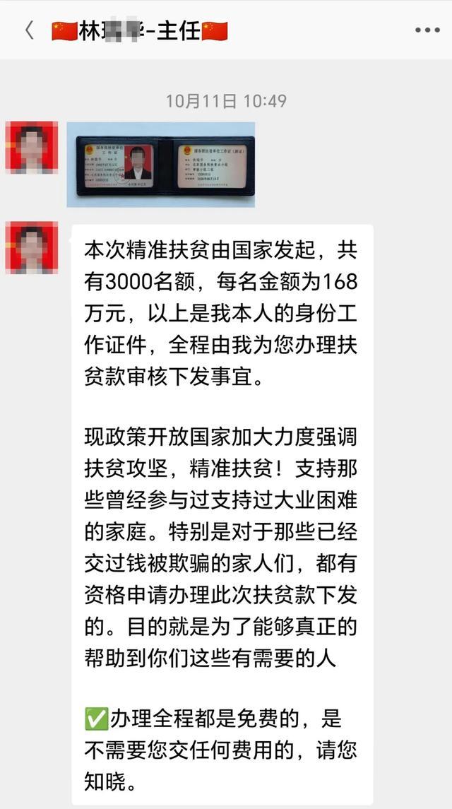 “林主任”称,现有一笔扶贫资金,将发给支持“民族大业”或“中国梦”项目的人,每人168万元,名额3000个。