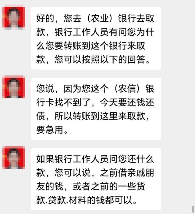 不法分子再三叮嘱“目标”,如果银行工作人员问取款去干什么,就说取款还账,如果问认不认识收款人,就说认识。又说,期间,如有公安机关或银行机构来电,不要接电话,同时,把银行机构工作人员的履职尽责说成:银行不是执法部门,无权劝阻老百姓取现、转账。不法分子还妄称:“借口就是怕你被骗”“现在银行真的是拿反诈的借口给人民层层限制”“取钱问这问那的”。