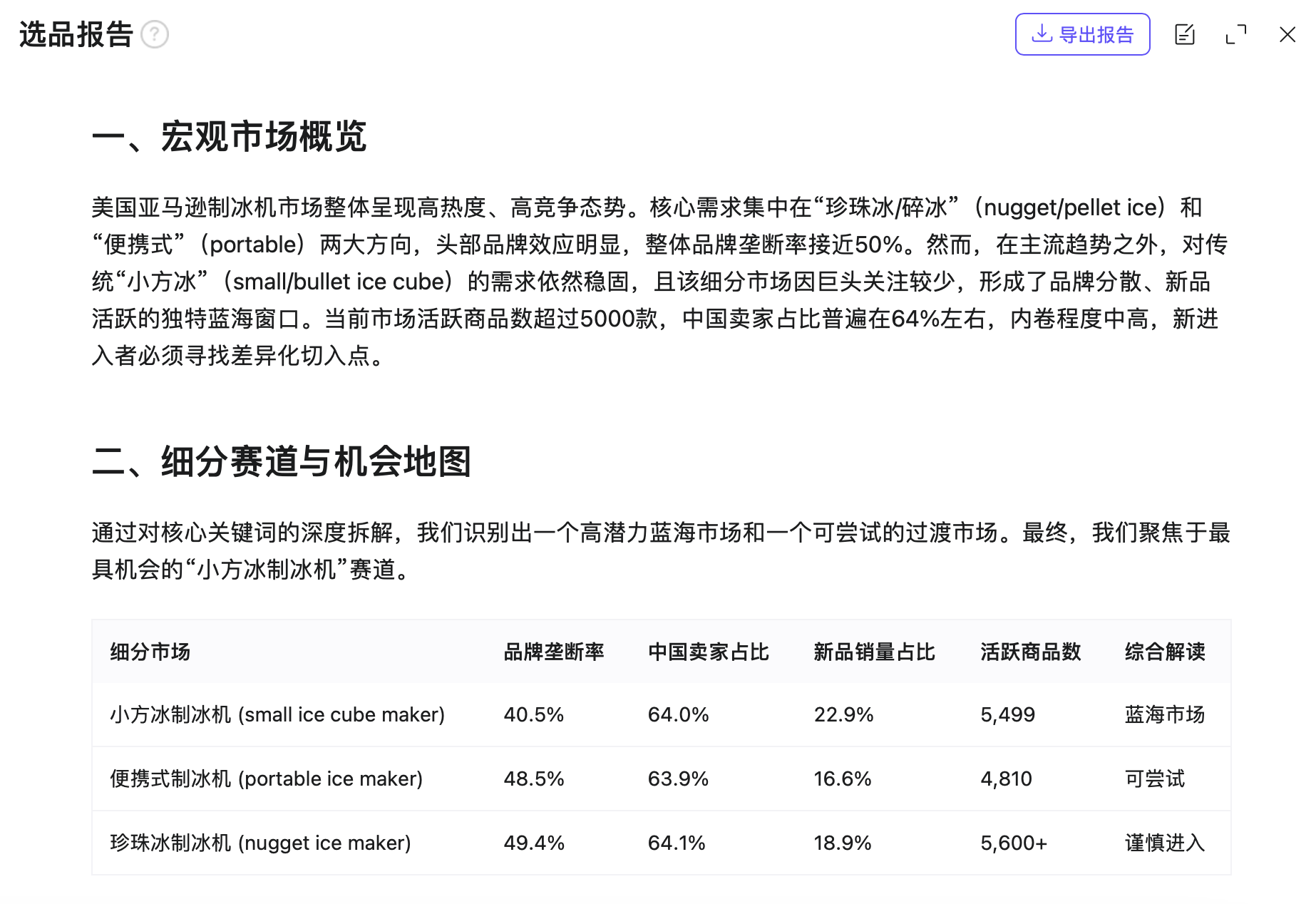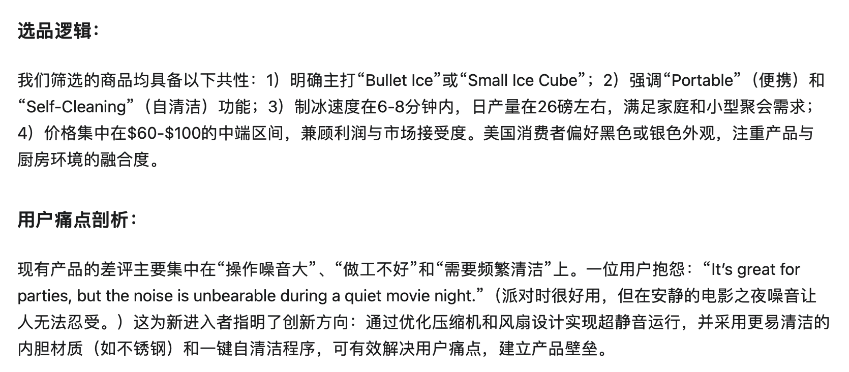 比如,在遨虾所给出的制冰机品类报告中,给出了相应的选品逻辑和用户痛点剖析:“现有产品的差评主要集中在‘操作噪音大’、‘做工不好’和‘需要频繁清洁’上。”