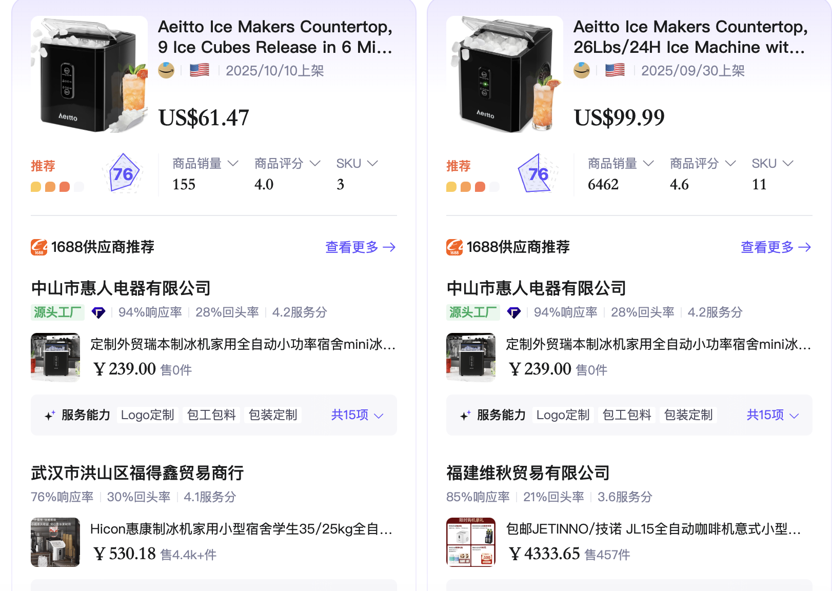 接下来,便是根据这些数据和信息选品、寻找合适的工厂。据悉,遨虾会通过算法匹配具备跨境服务、履约能力的厂商,生成涵盖资质认证、产能水平、履约口碑等维度的评估报告,展示给跨境卖家,方便寻找上游源头工厂。
