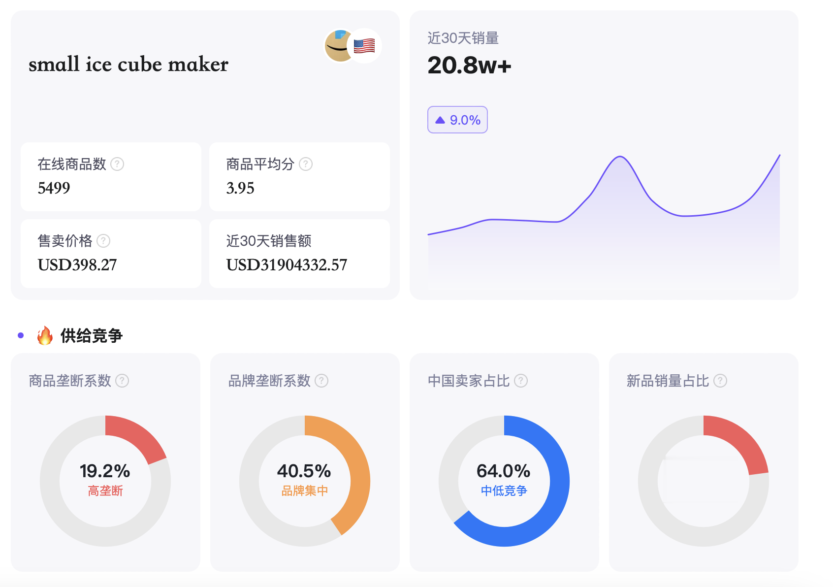 而基于1688每年2000亿跨境交易额的数据和平台公开信息,它同样能够梳理出关键词、近30天销量、商品垄断系数、品牌垄断系数、中国卖家占比等数据。