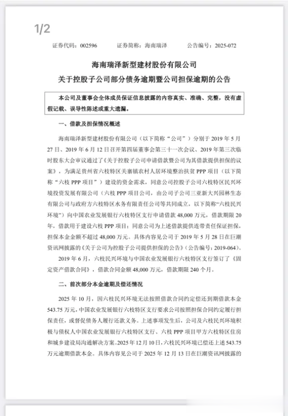 1月4日,海南瑞泽(002596.SZ)公告称,2025年10月因控股子公司六枝民兴环境无法按照借款合同约定偿还到期借款本金543.75万元,中国农业发展银行六枝特区支行要求公司按照担保合同约定履行担保责任,或督促债务人履行还款义务。
