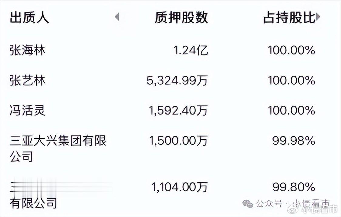 其中,股权质押方面,一致行动人张海林、张艺林和冯活灵均已全部质押海南瑞泽股票,三亚大兴集团和三亚厚德投资管理有限公司质押率也高达99.98%和99.8%。