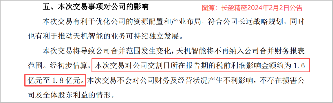 然而深入分析就会发现,长盈精密在2024年同期,处置了子公司天机智能30%的股权,产生了1.6—1.8亿元投资收益。这才让其净利润受到了高基数的影响,呈现出负增长的局面。