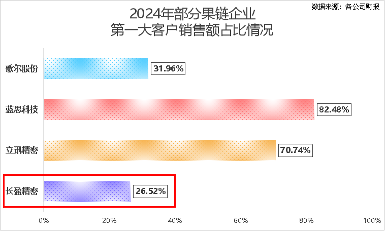 2024年,长盈精密从苹果获得的收入在总营收中占了26.52%,比上一年下降了1.20个百分点,远低于蓝思科技、歌尔股份以及立讯精密这些老牌果链企业。