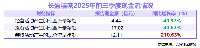 2025年前三季度,长盈精密经营活动、投资活动产生的现金流量净额分别为4.44亿元、-17.02亿元,同比下滑40.97%、40.62%;筹资活动产生的现金流净额为12.11亿元,同比激增210.63%。