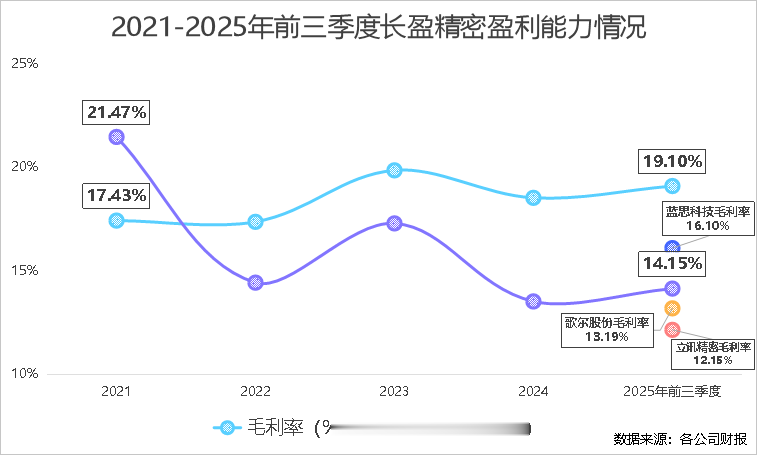 2025年前三季度,长盈精密的毛利率为19.10%,创历史新高,比立讯精密、蓝思科技以及歌尔股份,都要高出3个百分点以上。