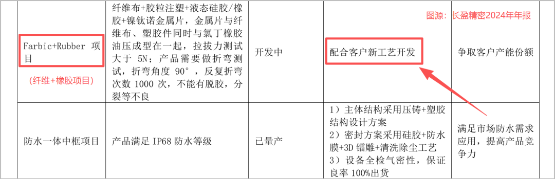 长盈精密在其2023年年报中明确表示,公司已具备了纤维材料的生产、加工能力,并配合大客户进行了项目开发并成功送样。2024年,公司还为了进一步配合客户新工艺的开发,开启了纤维+橡胶研发项目。