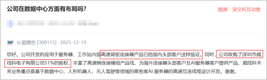此外,2025年12月19日,长盈精密在投资者互动平台表示,公司开发了应用于服务器、工作站内部的高速背板连接器产品,并已经给国内头部客户送样验证。