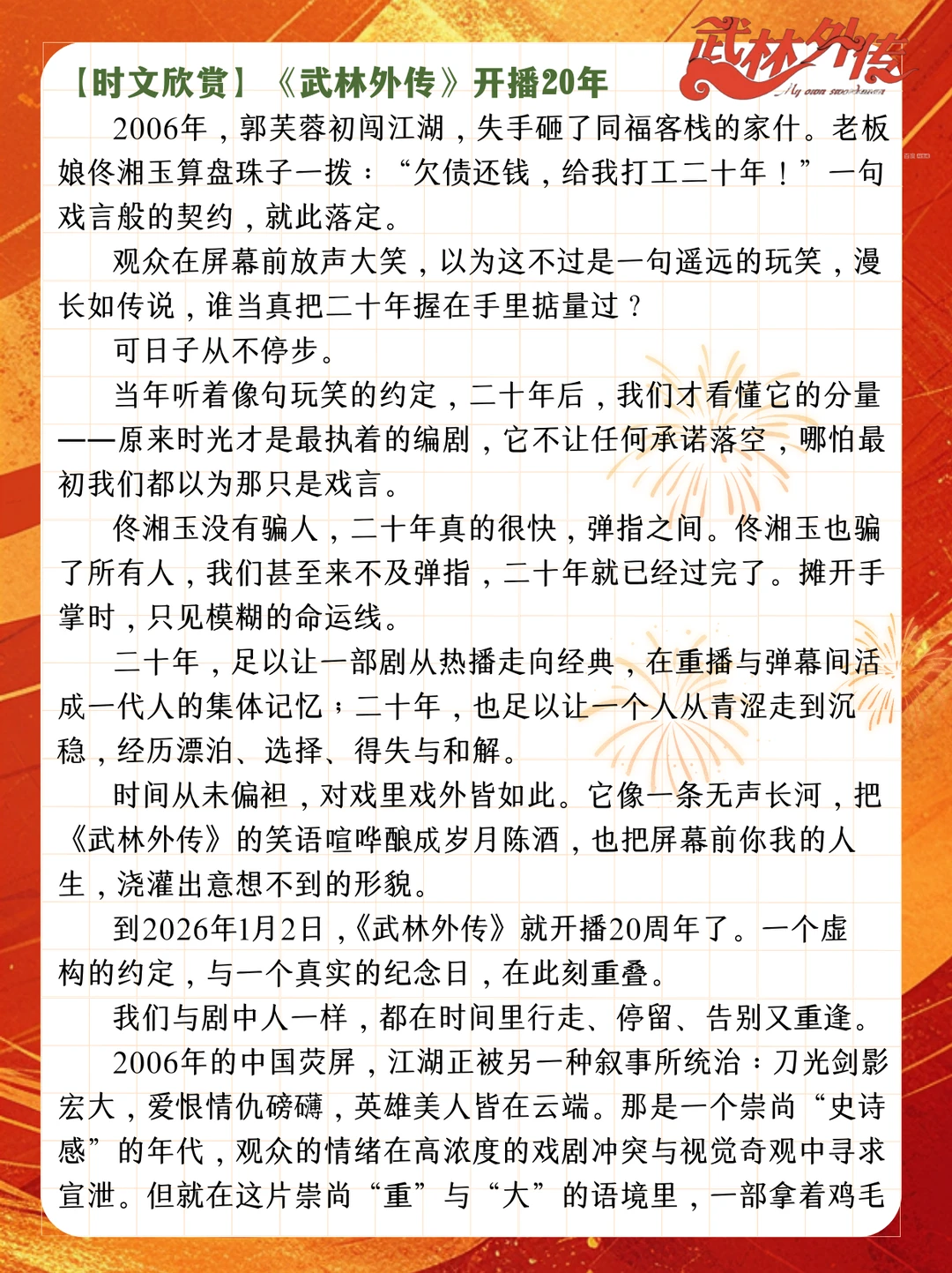 💕 2026年1月2日,《武林外传》开播20周年之际,一场跨次元庆祝引爆全网—一剧中郭芙蓉因砸店欠下48两银子,按每月2钱工钱需打工20年赎身,这个当年埋下的剧情伏笔,在现实中精准兑现。姚晨发文“小郭重获自由”,瞬间勾起当年观众的青春记忆。