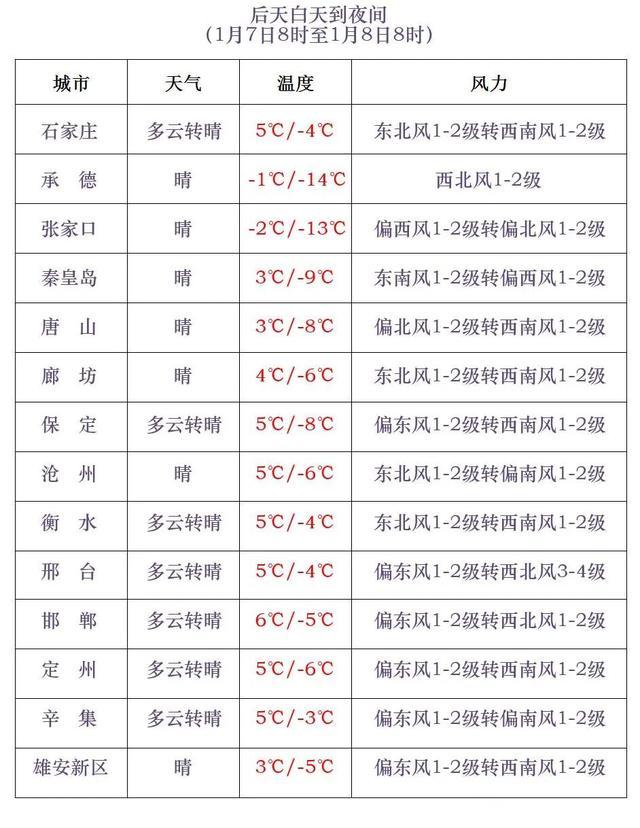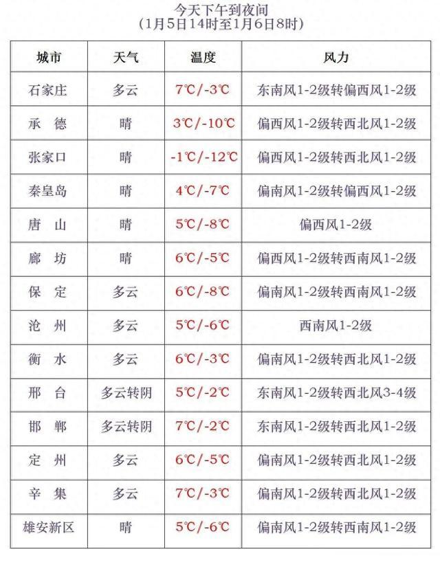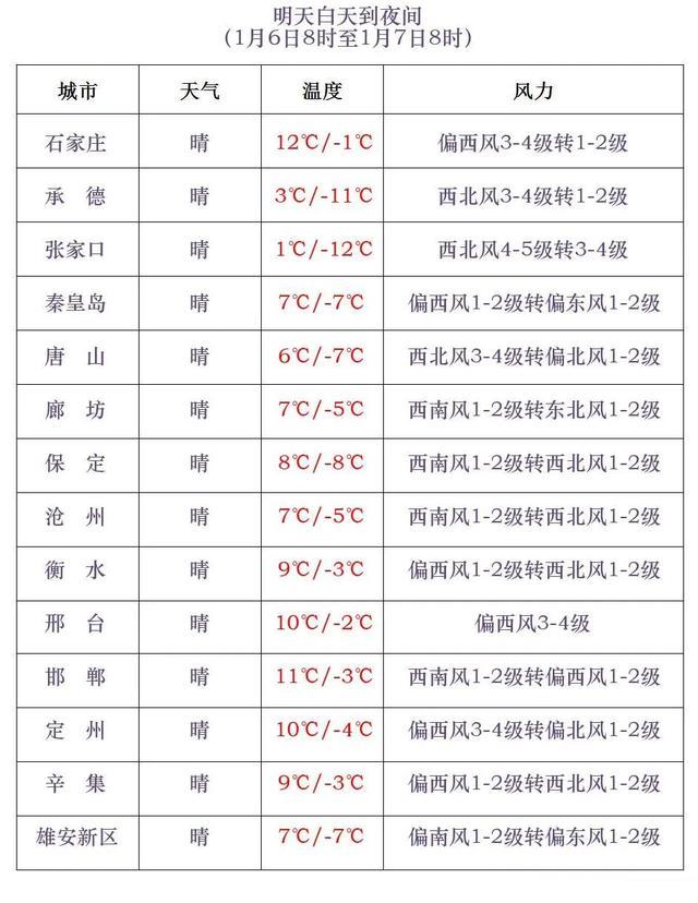 6日白天到夜间,张家口、承德、保定西北部和石家庄、邢台、邯郸三个地区的西部山区有西北风5到6级,阵风7到8级,局地阵风可达9级;6日夜间,渤海海域和沿海地区有偏北风5到6级,阵风7到8级。