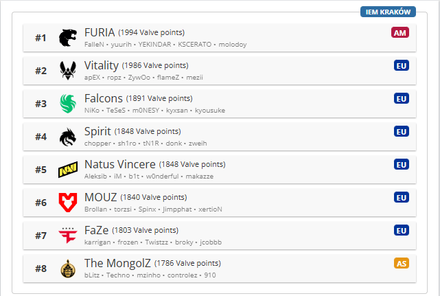 虎扑01月05日讯1月6日凌晨(即北美时间1月5日),Valve将更新一月份VRS官方排名,该份名单将决定今年首场超级精英赛事——IEM克拉科夫站的24个参赛名额。