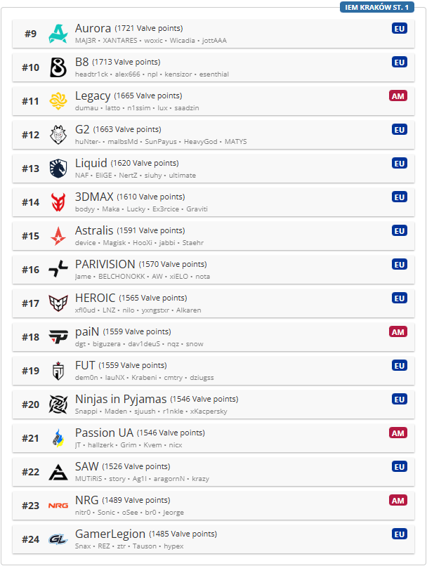 第一阶段入围赛的16个参赛名额方面,以第九名的Aurora为领衔,接下来分别是:B8、Legacy、G2、Liquid、3DMAX、Astralis、PARIVISION、HEROIC、paiN、FUT、NiP、PassionUA、BC.Game(已收购SAW核心三人组)、NRG和GamerLegion。