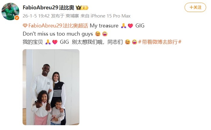 法比奥社媒写道:Mytreasure🙏GIGDon’tmissustoomuchguys😉😀我的宝贝🙏GIG别太想我们哦,同志们😉😀