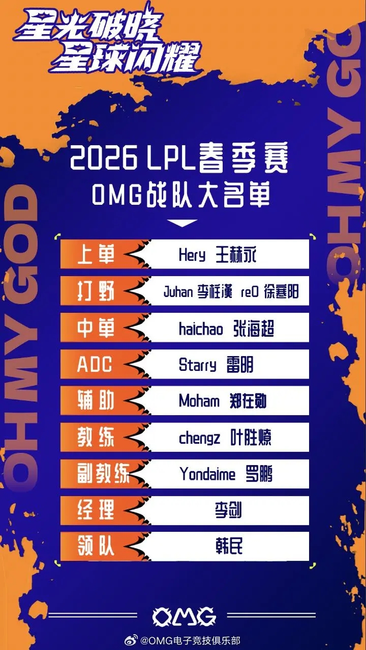 OMG发布2026LPL春季赛大名单暨赛程表:Juhan、Starry在列
