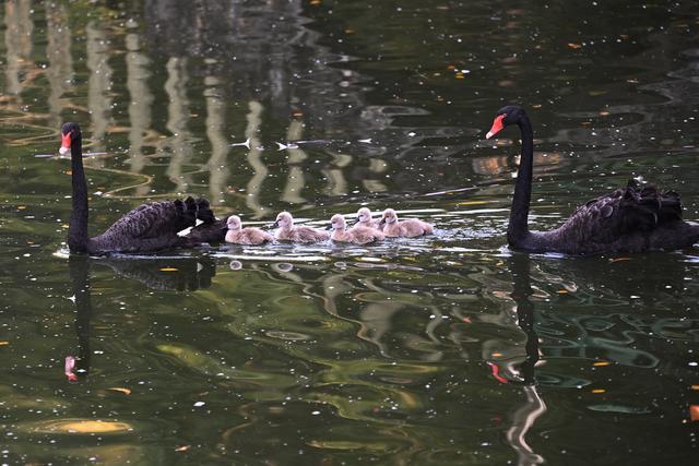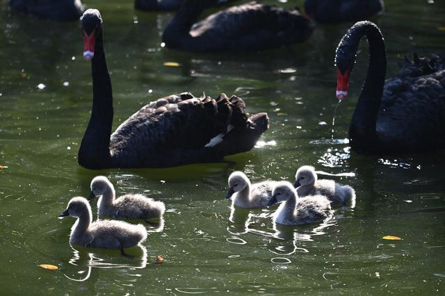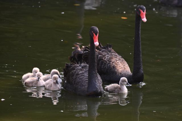 1月5日,深圳野生动物园天鹅湖里,5只小黑天鹅在其“父母”的保护下,小家伙们一起游动、觅食、玩耍,“天鹅夫妇”对小家伙们疼爱有加,把自己所有的生活技能毫无保留地传授给小天鹅们,小家伙们细心地跟着“父母””学习生活本领。黑天鹅一家享受天伦之乐。