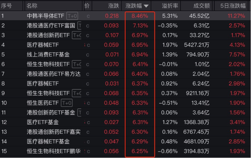 具体到单只产品上,华泰柏瑞中韩半导体ETF单日涨幅达8.46%,领跑场内千余只ETF。港股医药再次崛起,富国港股通医疗ETF、汇添富港股通创新药ETF分别以7.13%、6.97%的涨幅紧随其后。医疗器械ETF、线上消费ETF等涨幅居前。