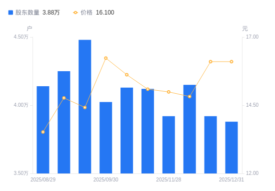 日期A股户数(户)流通A股户均持股数(股)户均持股市值(万元)2025-12-313880019376.6131.202025-12-193920019178.8930.882025-12-104150018115.9626.852025-11-283920019178.8928.752025-11-104120018247.8727.542025-10-314130018203.6928.432025-09-304023518685.5330.332025-09-194480016781.5324.202025-09-104250017689.7026.132025-08-294140018159.7224.55