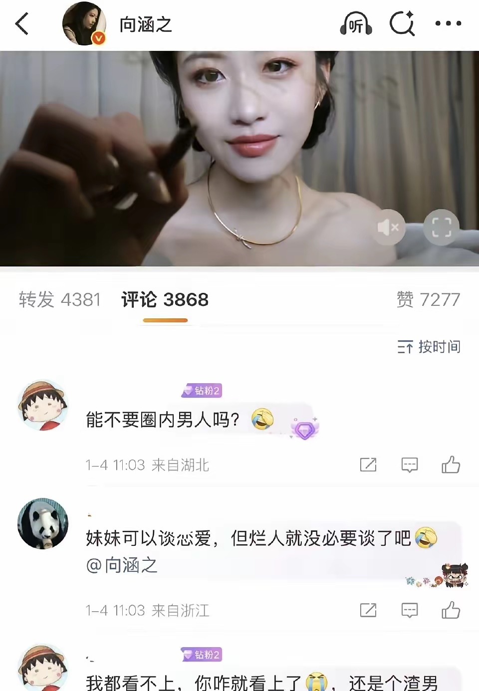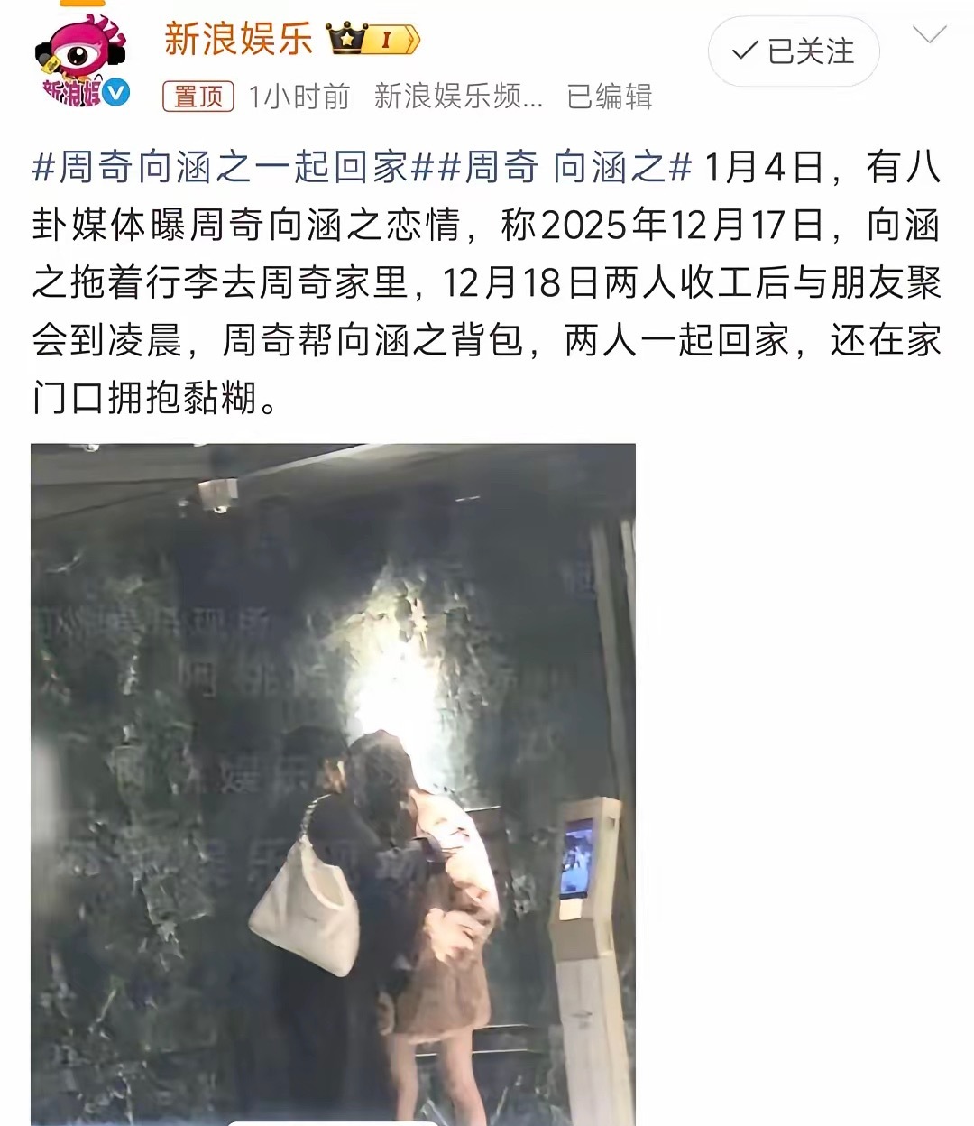 周奇 聊天记录向涵之也是够倒霉的,偏偏被拍到和周奇一起回家!1月4日,知名娱记晒出一段视频,爆料称12月17日和18日,拍到向涵之和周奇一起去参加盛典,结束后和友人聚餐,最后两人乘车回家,在家门口拥抱。这个拥抱,知名娱记还特意用黏糊了一阵来形容,看了视频,并没有如此夸张。一般来说,明星被拍到一起聚餐,回家,也挺正常,就算恋爱了,也不为过吧!然而,向涵之的评论区沦陷了,粉丝纷纷留言,希望赶紧分手。其实,也可以理解,女网红司晓迪曝出开年大瓜,自称很多顶流都曾拜倒在她的石榴裙下,其中,就有一条信息特意艾特周奇,聊天记录显示,12月19日,两人还在互动。当然,司晓迪已经删除爆料内容,所以,聊天截图,包括照片,估计都不是真的,没准对于周奇来说,也是受害者。只能说,向涵之也是够倒霉的,偏偏被拍到和周奇回家,不知道,如果看到司晓迪的爆料,会是什么感受?话说,也有可能向涵之和周奇只是好朋友,希望大家理性吃瓜,还是等待当事人的回应吧!