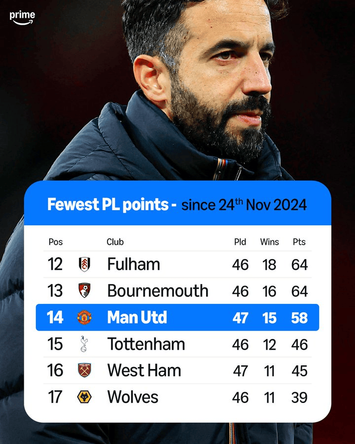 Prime发布的统计显示,自2024年11月24日阿莫林执教曼联的首场英超比赛以来,在“英超从未降级”的俱乐部范围内,曼联同期拿到的联赛积分仅好于三队:热刺、西汉姆联和狼队。