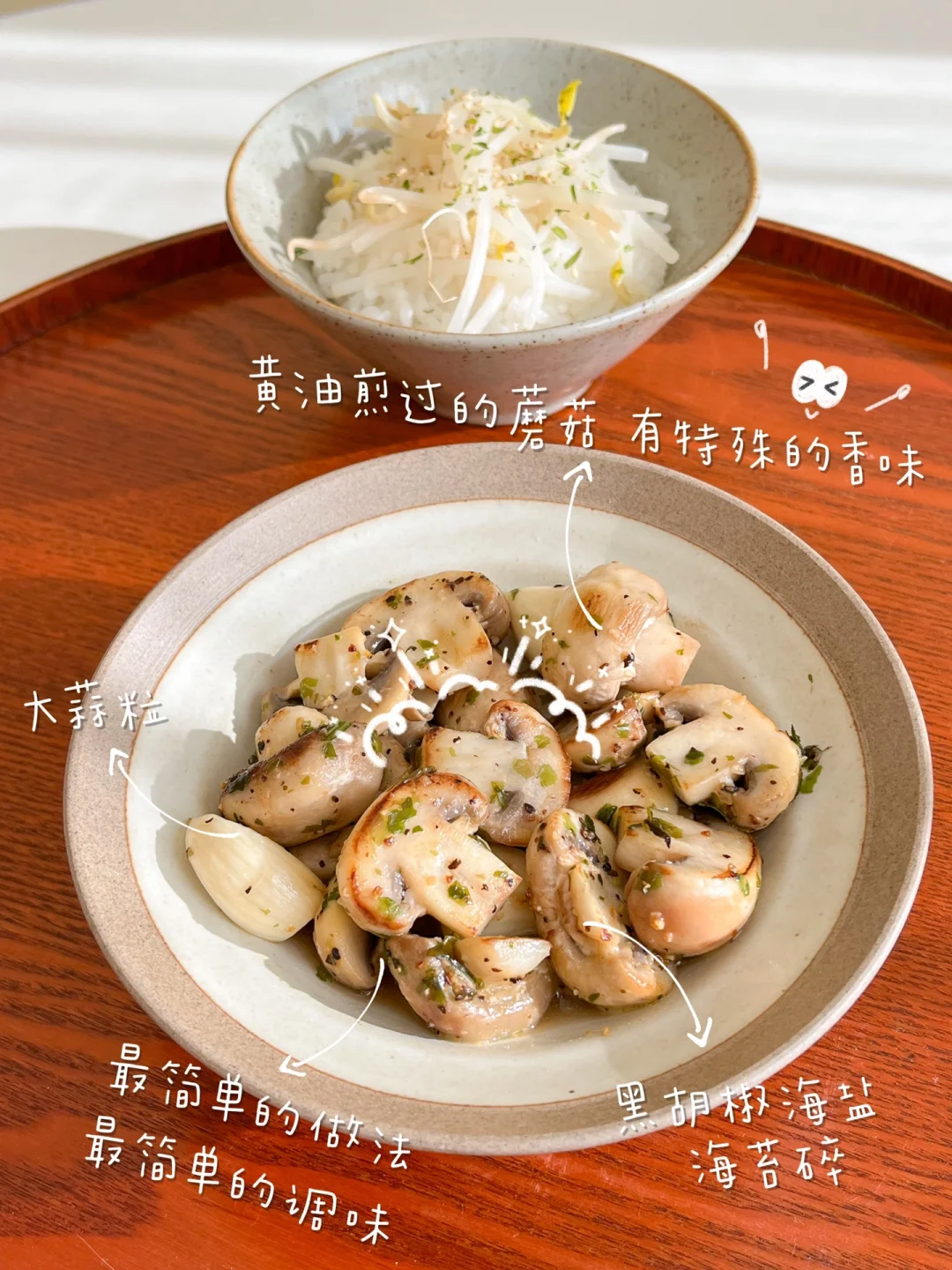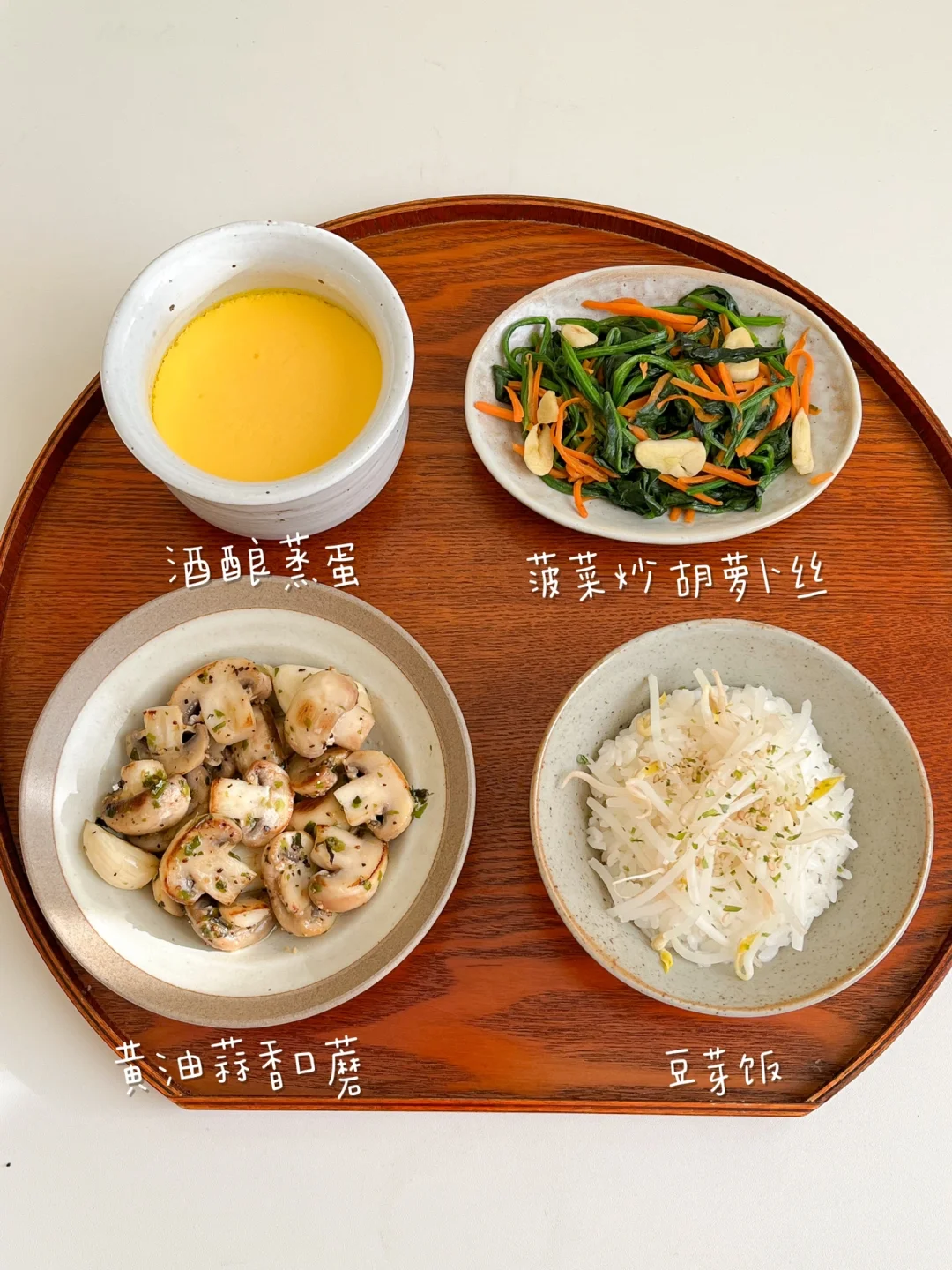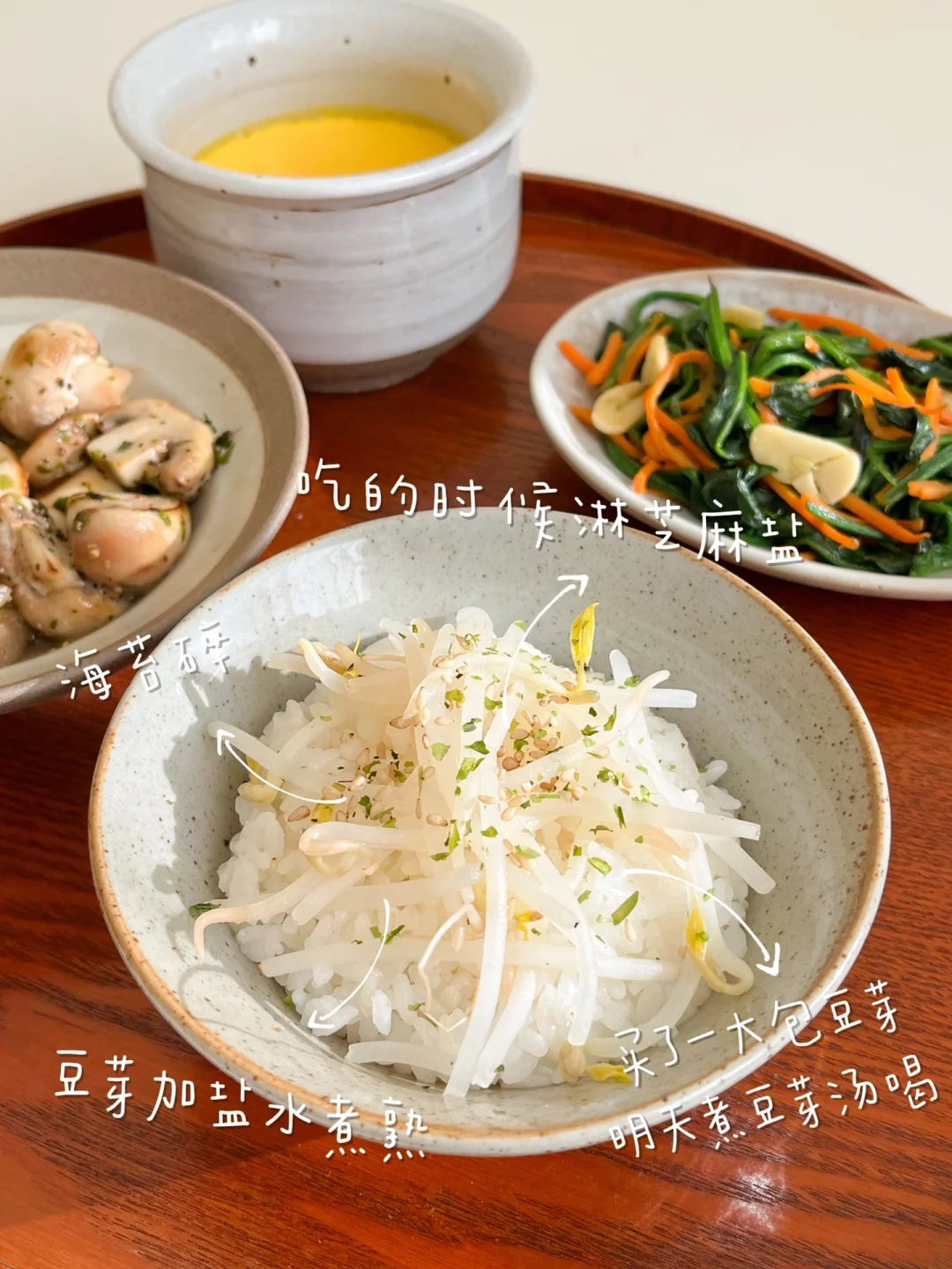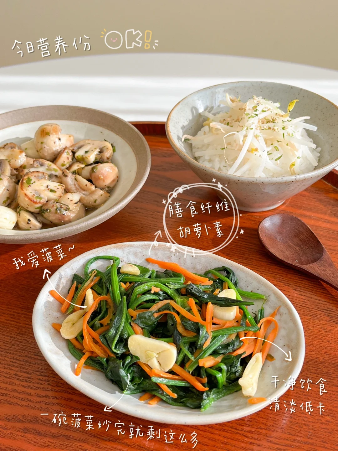 “一周选一到两天吃素食是很好的选择,可以减轻肠胃的负担,排排身体多余垃圾。简单的素食也可以做的美味,蘑菇和鸡蛋是我的首选!调味简单一点,量少一点,吃完身体很舒服~” 今日素食午餐: ¹菠菜炒胡萝卜丝 ²黄油蒜香口蘑 ³酒酿蒸蛋 ⁴豆芽饭