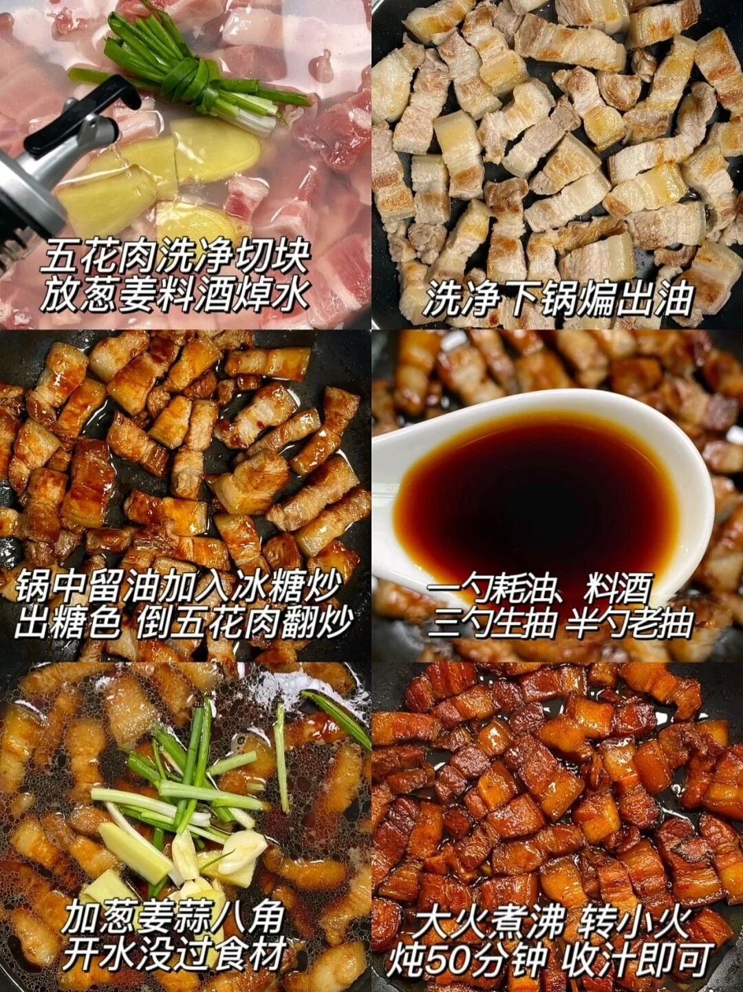 五花肉、冰糖、葱、姜、蒜、八角、料酒、生抽、蚝油、老抽、食用油、水