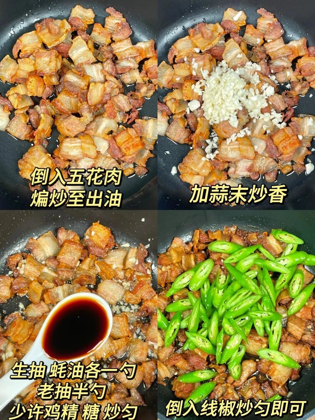 五花肉、蒜、线椒、生抽、蚝油、老抽、鸡精、糖、食用油