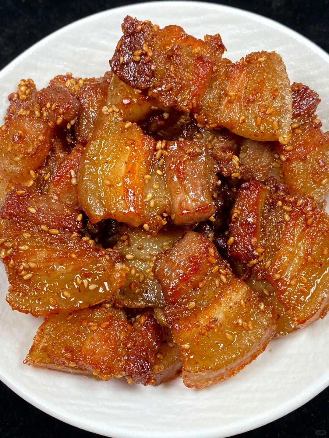 放入煎好的五花肉块,快速翻炒均匀,让每块肉都裹满酱汁,继续中小火翻炒至酱汁浓稠收汁,即可出锅。