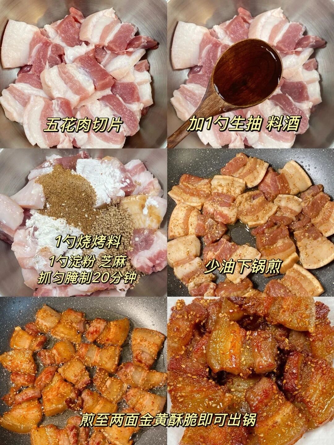 热锅倒少许食用油,油热后放入裹好淀粉的五花肉块,中小火煎至两面焦黄,捞出多余油脂。