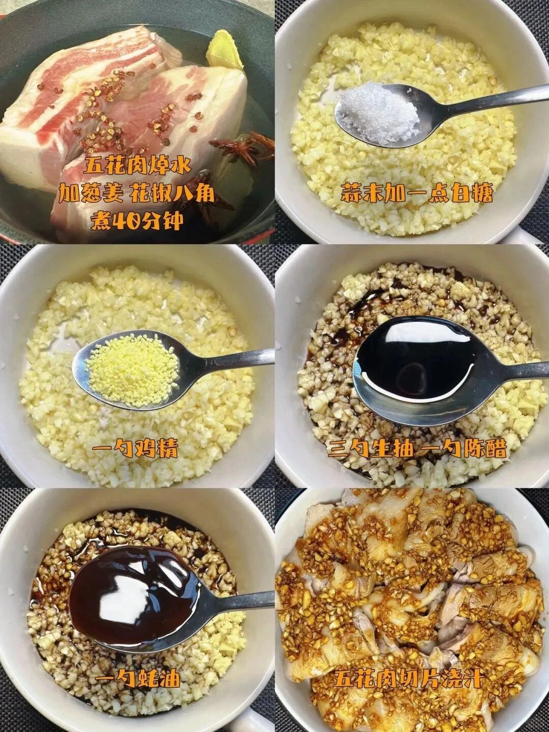 五花肉、葱、姜、花椒、八角、蒜末、白糖、鸡精、蚝油、生抽、陈醋、水